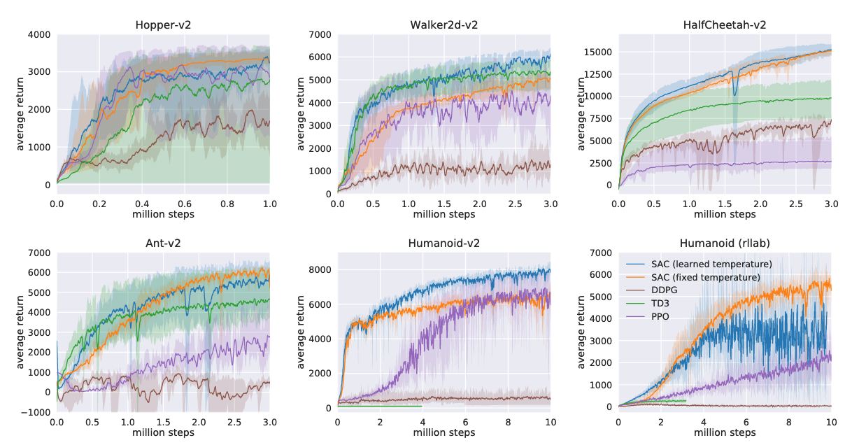 Training curves on benchmark tasks. Image credit: Soft Actor-Critic Algorithms and Applications (Haarnoja et al. 2019).