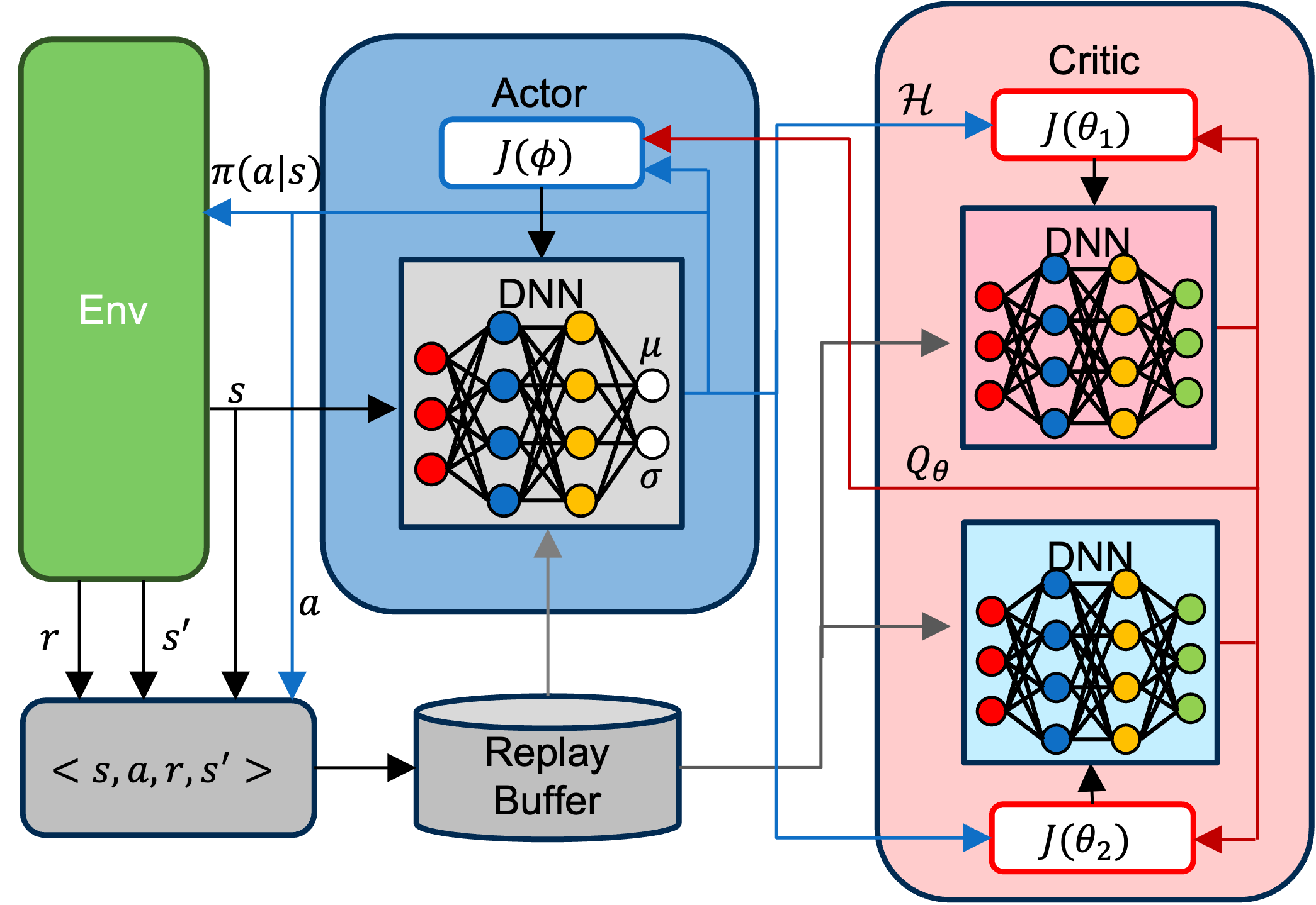 - Entropy regularization: Encourages exploration by using the actor’s output to compute policy entropy \(\mathcal{H}\), which directly influences the critic updates.